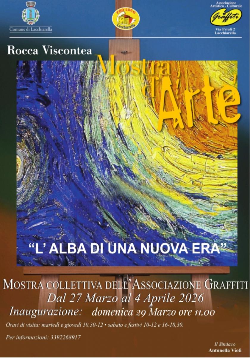 Espongo i miei dipinti "La Palma di Cafarnao" e "Dal Monte delle Beatitudini", olio su tela, 50 x 40 cm, alla mostra collettiva d'arte "L'Alba di una nuova era", organizzata dall'Associazione Culturale Artistica Graffiti. Dal 27 marzo al 4 aprile 2026. Inaugurazione domenica 29 marzo alle ore 11.00. Rocca Viscontea, Piazza Risorgimento, Lacchiarella (MI). Orari di visita: martedì e giovedì 10.30 - 12.00, sabato e festivi 10.00 - 12.00, 16.00 - 18.30. Per informazioni: 3392268917